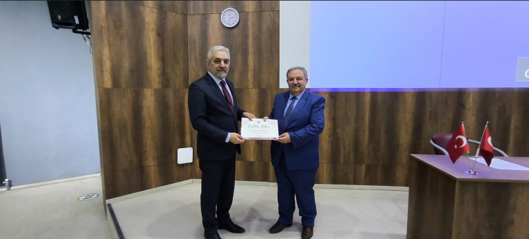Konferans sonrası Rektör Yardımcımız Prof. Dr. Mahmut DOĞRU, Prof. Dr. Mutlu DEVECİ'ye teşekkür belgesi sunmuştur.