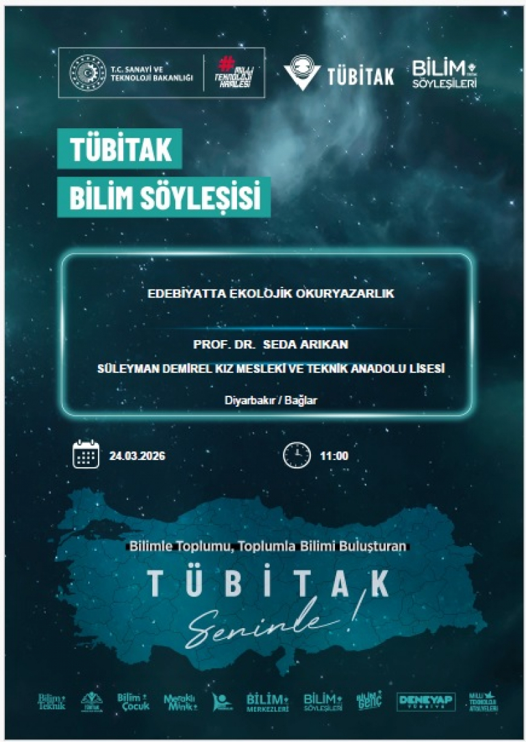 Fakültemiz Batı Dilleri ve Edebiyatları Bölümü Öğretim Üyesi Prof. Dr. Seda ARIKAN, Diyarbakır Süleyman Demirel Kız Mesleki Teknik ve Anadolu Lisesi'nde TÜBİTAK Bilim Söyleşileri kapsamında "Edebiyatta Ekolojik Okuryazarlık" başlıklı söyleşi ile gençlerle buluştu.