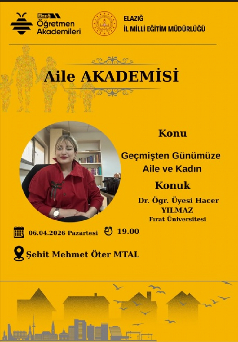 Bu kapsamda Fakültemiz Tarih Bölümü Dr. Öğretim Üyesi Hacer YILMAZ 06 Nisan 2026 tarihinde saat 19.00'da Şehit Mehmet Öter MTAL'de Aile Akademisi başlığı altında "Geçmişten Günümüze Aile ve Kadın" konusunda öğretmenlerimizi bilgilendirmiştir.