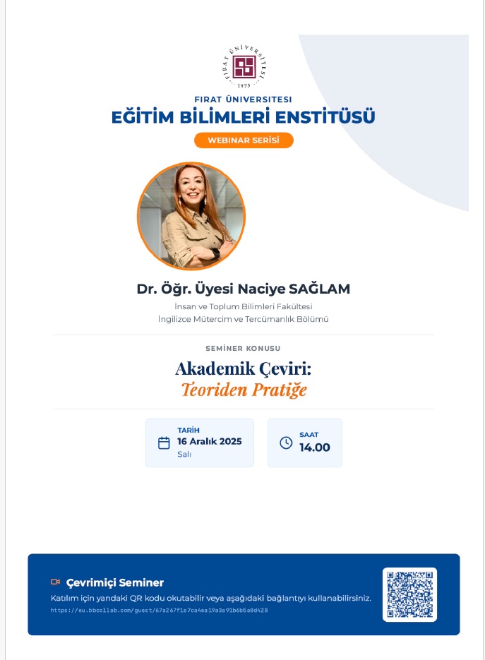 Fırat Üniversitesi Eğitim Bilimleri Enstitüsü tarafından gerçekleştirilecek Webinar Serisi programları kapsamında, 16 Aralık 2025, saat 14.00'da, Fakültemiz İngilizce Mütercim ve Tercümanlık Bölümü Dr. Öğr. Üyesi Naciye SAĞLAM tarafından "Akademik Çeviri: Teoriden Pratiğe" konulu bir seminer düzenlecektir. Katılım için link: ...