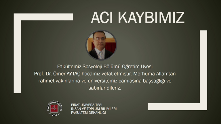 Fakültemiz Sosyoloji Bölümü Öğretim Üyesi Prof. Dr. Ömer AYTAÇ hocamız vefat etmiştir. Merhuma Allah'tan rahmet yakınlarına ve üniversitemiz camiasına başsağlığı ve sabırlar dileriz. Fırat Üniversitesi İnsan ve Toplum Bilimleri Fakültesi Dekanlığı