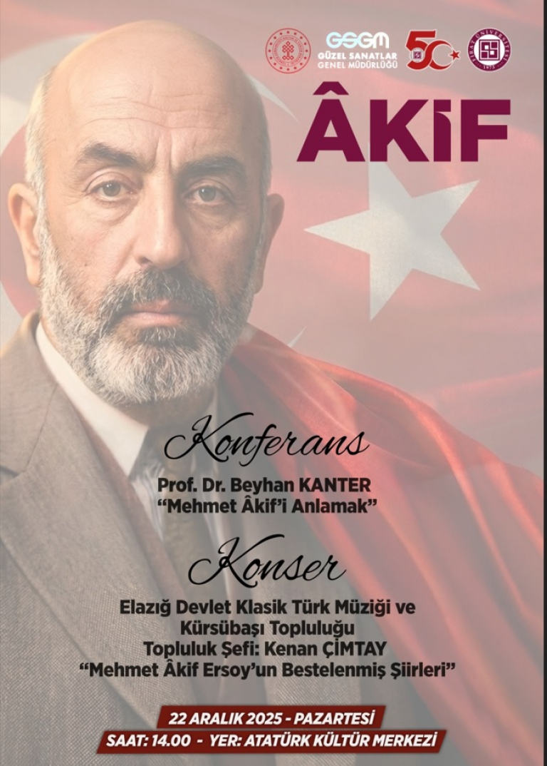 Millî Mücadele'nin amacını ve ruhunu, milletin birlik ve beraberliği ile bağımsızlık isteği ve azmini dile getiren İstiklal Şairimiz Mehmet Akif ERSOY'u Anma Haftası etkinlikleri kapsamında, Kültür ve Turizm Bakanlığı Güzel Sanatlar Genel Müdürlüğü ve Fırat Üniversitesi işbirliği ile 22 Aralık 2025 Pazartesi günü, saat 14.00'da Atatürk Kültür ...