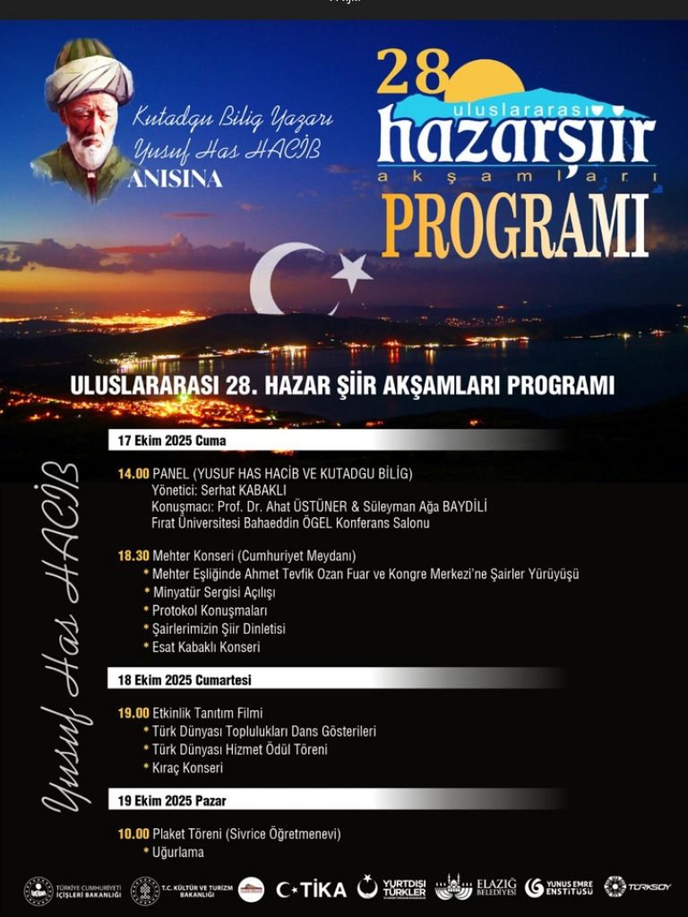 Fırat Üniversitesi bu yıl "Altaylar'dan Hazar'a" temasıyla 28. Uluslararası Hazar Şiir Akşamları'nın açılış programında yer alan "Yusuf Has Hacib ve Kutadgu Bilig" paneline ev sahipliği yaptı.