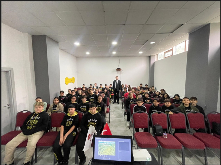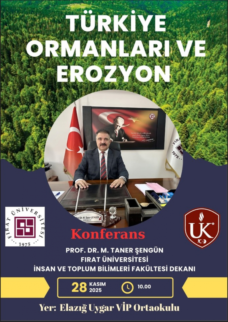 28 Kasım 2025 tarihinde saat 10.00'da Elazığ Uygar Vip Ortaokulu'nda gerçekleşen konferansta, Dekanımız, ortaokul öğrencilerini "Türkiye Ormanları ve Erozyon" konusunda bilgilendirmiştir.